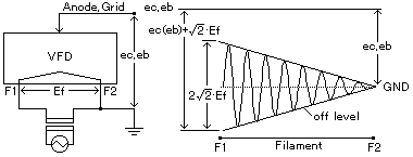 A 17. ábrán bemutatott áramkör táplálja a VFD-t. A Vdisp = ebc + Ek (Voltban), ahol az anód és rács feszültsége egyenlő (ebc=ec=eb), és a negatív előfeszültség Ek. Ezt a feszültséget érdemes stabilizálni, mert váltakozásai zavarhatják a frissítési frekvenciát és/vagy villódzást okozhat.